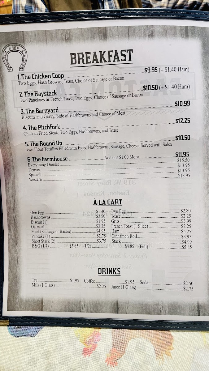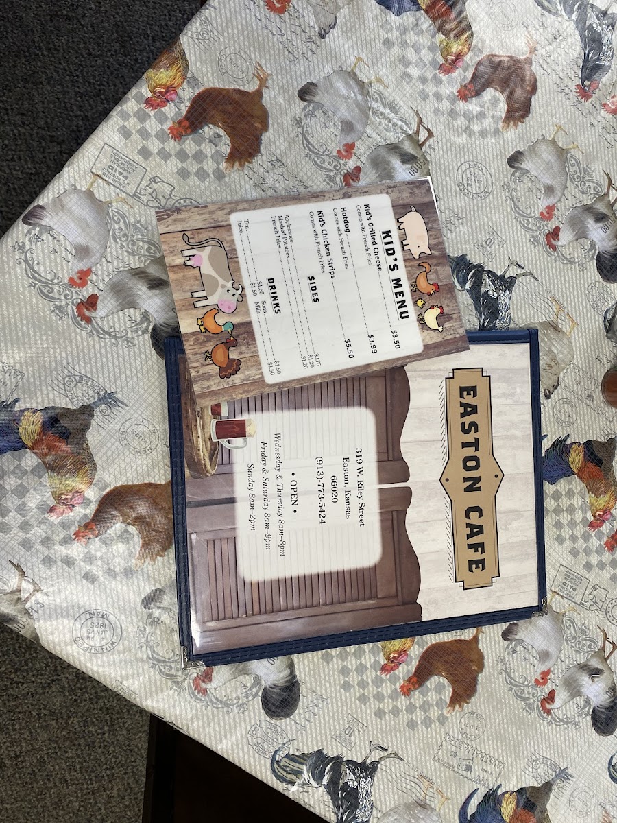 Nestled in the heart of Easton, Kansas, at 319 W Riley St, Easton Cafe LLC is the perfect spot for both hearty meals and delightful bites. Our menu is a celebration of flavors, thoughtfully crafted to satisfy diverse cravings. Start your day right with our famed Breakfast Burrito or savor the comforting allure of our Biscuits and Gravy Sausage and Hash Browns. For lunch or dinner, don't miss out on our succulent Ribeye Steak paired with a perfectly Baked Potato, or try the crispy Fried Catfish Fillets served with Fries and Slaw. Seafood lovers will relish our Boiled Shrimp accompanied by fresh Carrots, while our Classic Hamburger with Onion Rings offers a timeless taste of Americana. And for those craving something a little smokier, our rich and juicy Brisket will surely hit the spot. Come explore the delicious offerings at Easton Cafe LLC, where every dish is crafted with care and a touch of Kansas hospitality!